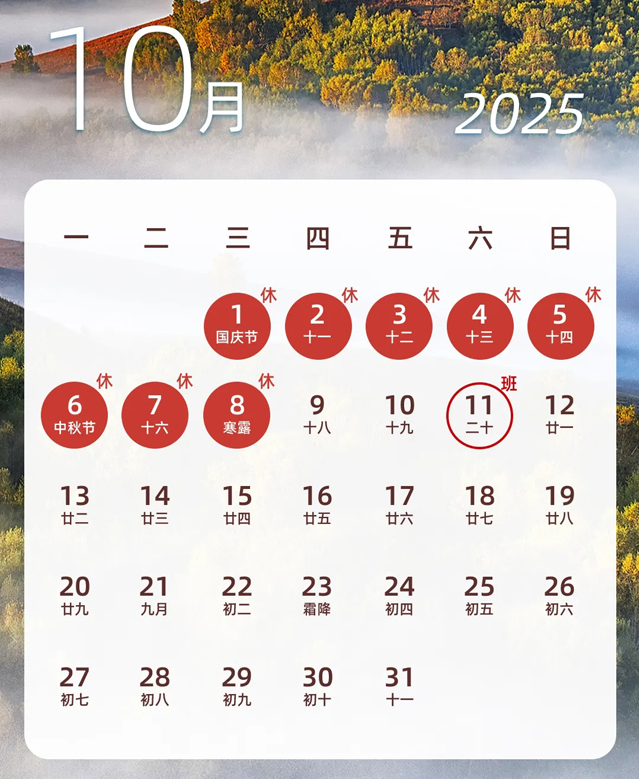 中秋团圆与国庆欢腾交织成美丽的节日画卷。在这个即将到来的日子里,愿我们继续携手,以音频和视频等控制系统,创造的声、光、电为科技笔,共绘智造蓝图,祝双节快乐,月圆人团圆。愿您的事业如精准的3D打印,层层构筑辉煌;生活如智能的算法,日日优化美满。祝中秋国庆快乐!公司放假安排如下: